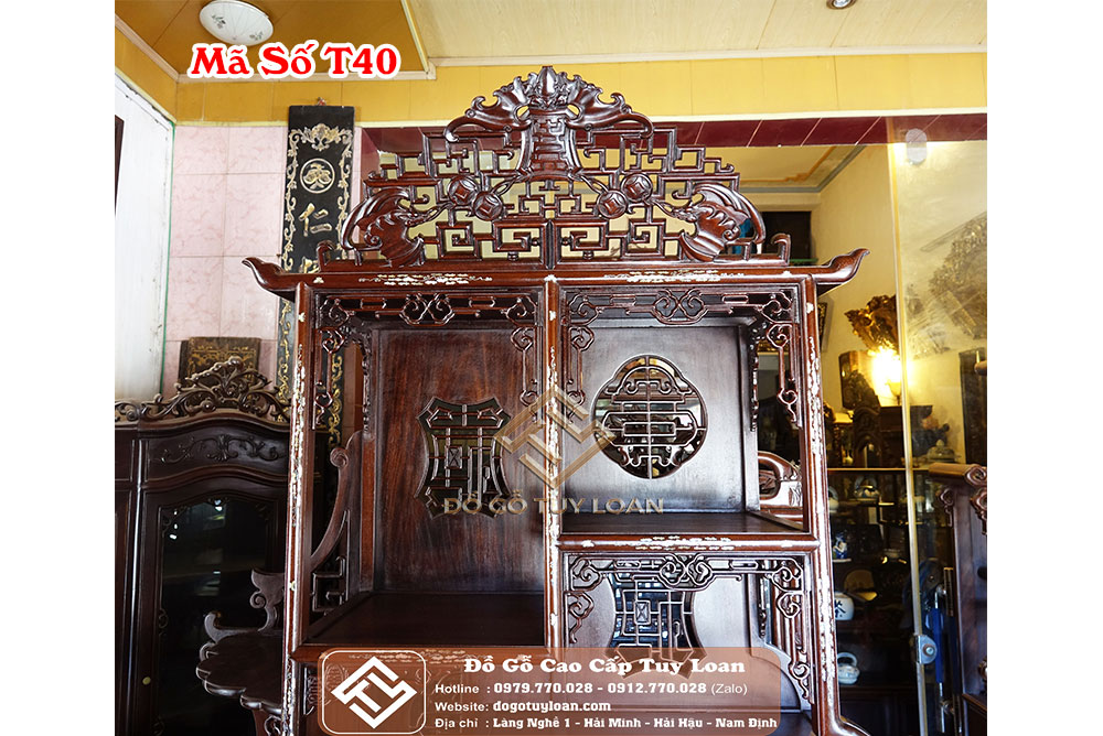 Đồ Gỗ Tuy Loan xin giới thiệu sản phẩm Tủ Bày Đồ Lệch Khảm Ốc mã số T40, chiếc tủ có thiết kế giống Tủ Bày Đồ Lệch T38, được người thợ khéo léo khảm những miếng ốc sáng lấp lánh làm nổi bật chiếc tủ